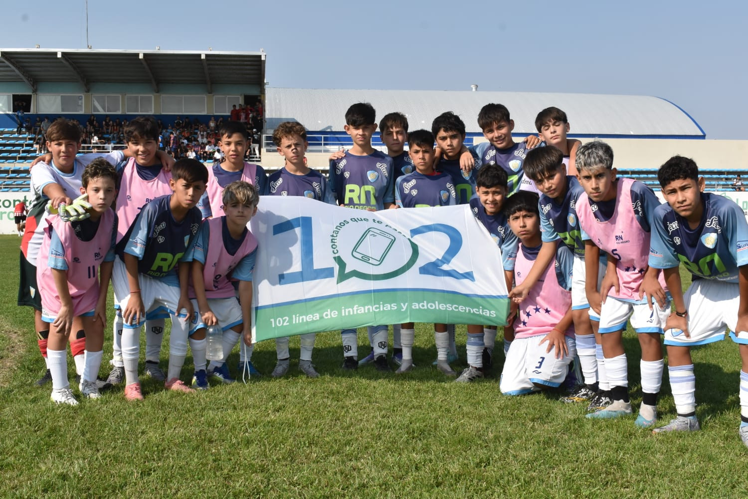 En ese contexto, durante un encuentro emblemático de la comarca entre Sol de Mayo y Deportivo Patagones, los equipos posaron con las banderas de la Línea 102 y recibieron un presente institucional para compartir con sus compañeros.
